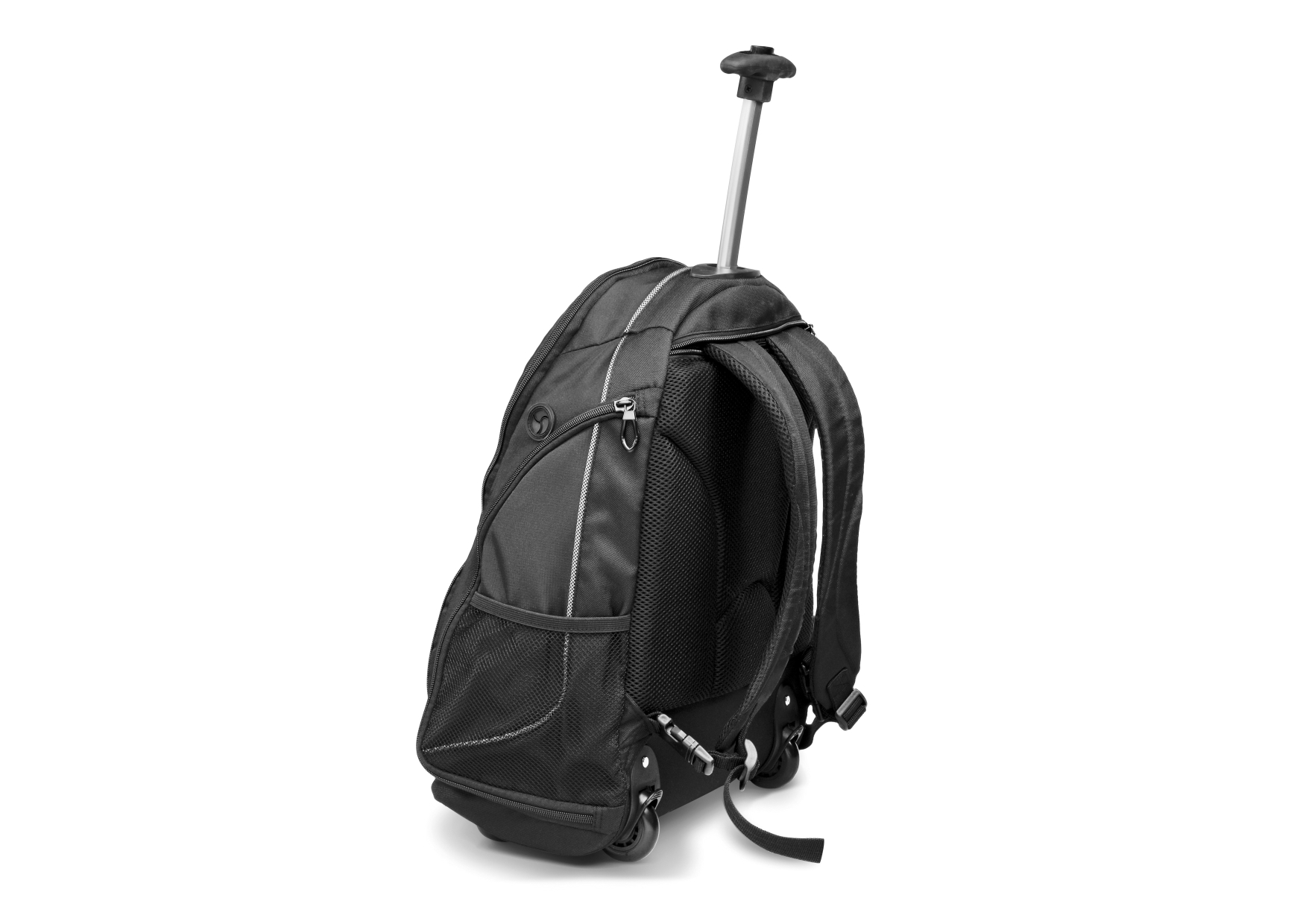 Main zippered compartment . Holds most 15.6" laptops. Front zippered media pocket with padded grab handle giving it a unique design. Dual side zippered pockets with organisers. Dual mesh water bottle pockets. Adjustable, padded, tuck away shoulder straps . Padded air mesh back panel for that extra comfort. Telescoping handle. Ripstop with PU & 600D backing & 210D lining. 35 (w) x 22 (d) x 45 (h)