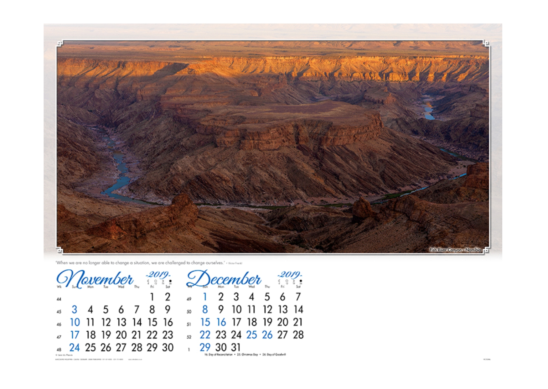 A wise person once said that Life is not measured by the number of breaths we take, but by the moments that take our breath away… We invite you to take a moment to drink in the beauty of these African sceneries… They will take your breath away and sweep you off on a journey through southern Africa. Each image is complemented by an object that reflects the cultural character of the area, as well as a motivational quote for additional impact. Just the right mix of attributes to ensure your brand is present during all the important moments your clients experience in 2018.