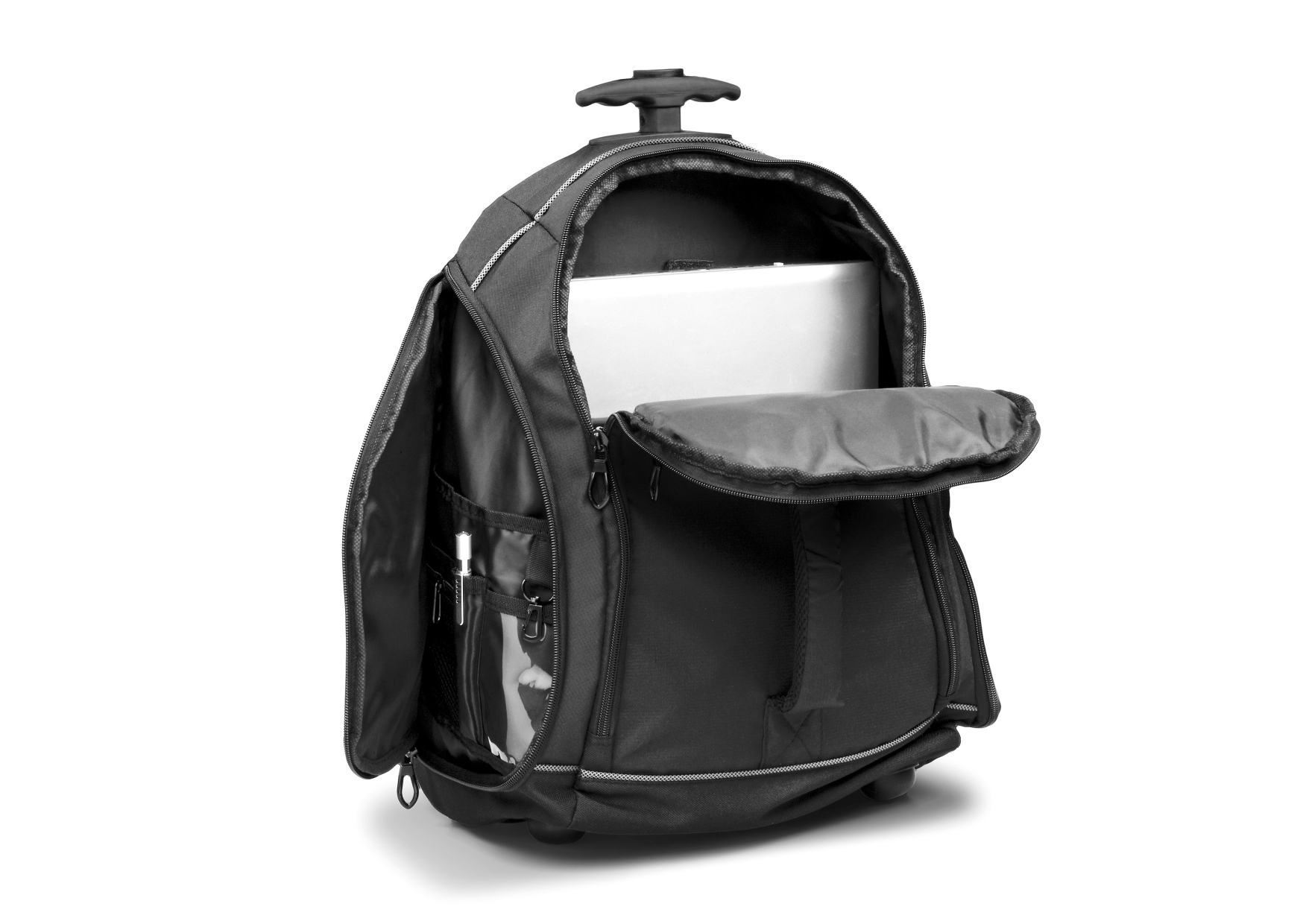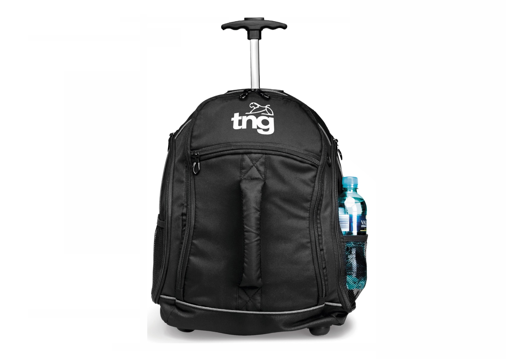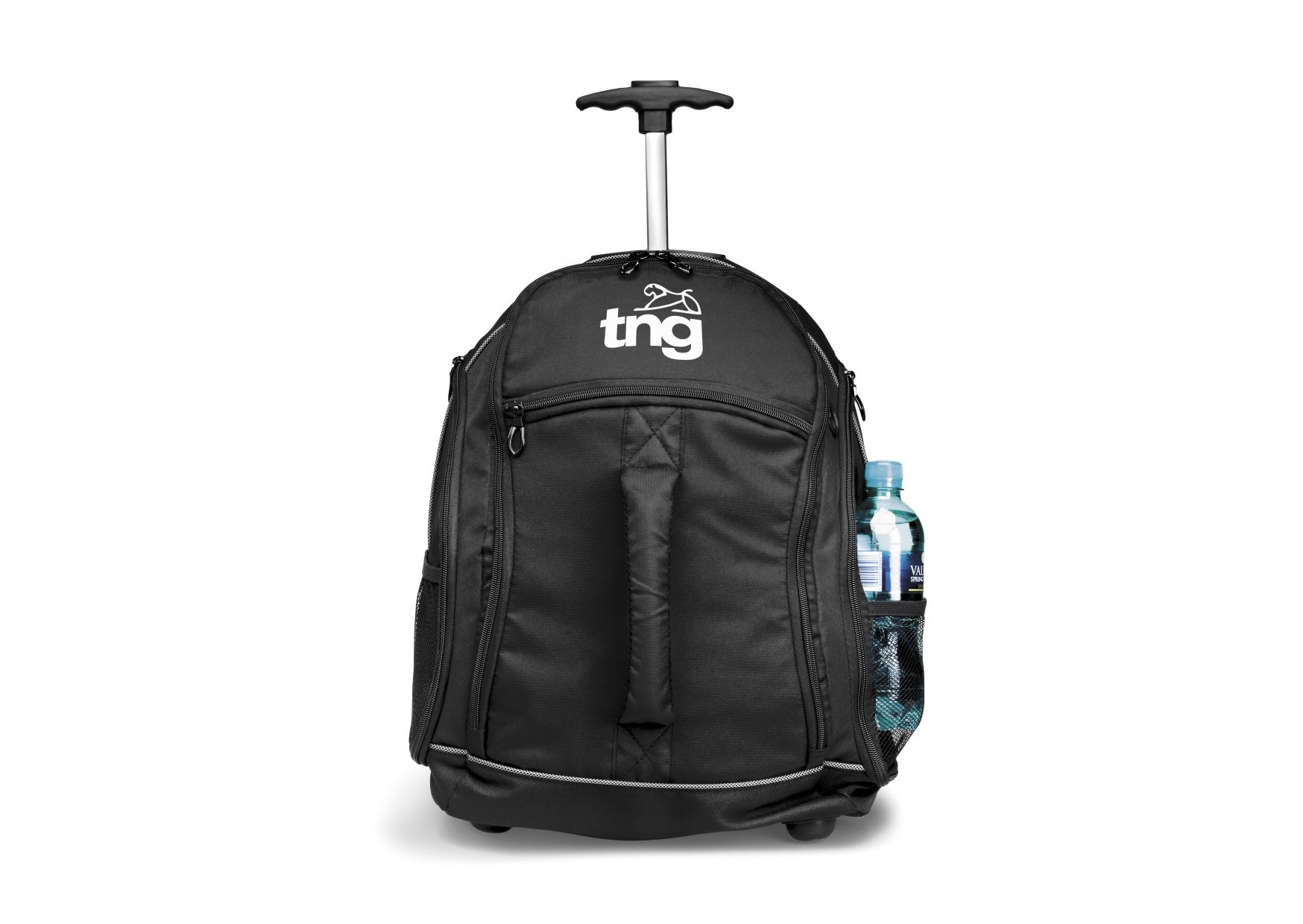 Main zippered compartment . Holds most 15.6" laptops. Front zippered media pocket with padded grab handle giving it a unique design. Dual side zippered pockets with organisers. Dual mesh water bottle pockets. Adjustable, padded, tuck away shoulder straps . Padded air mesh back panel for that extra comfort. Telescoping handle. Ripstop with PU & 600D backing & 210D lining. 35 (w) x 22 (d) x 45 (h)